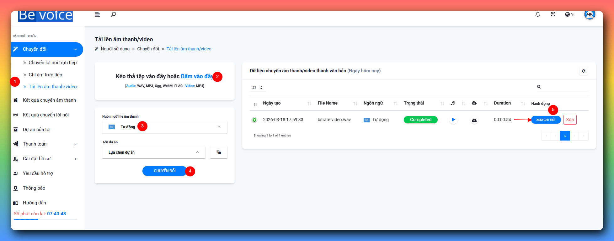 2️⃣ Bước 2: Upload tệp Âm thanh hoặc Video (.MP4) lên bevoice.net để chuyển đổi sang văn bản